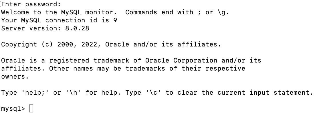 위 명령어를 입력하면 비밀번호를 입력하라고 뜬다. 3-2에서 확인했던 임시 비밀번호를 입력하고 엔터를 뙁 치면 아래와 같이 접속이 정상적으로 이루어짐을 확인할 수 있다.