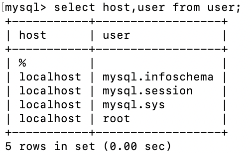 mysql> select host,user from user; # 다시 확인