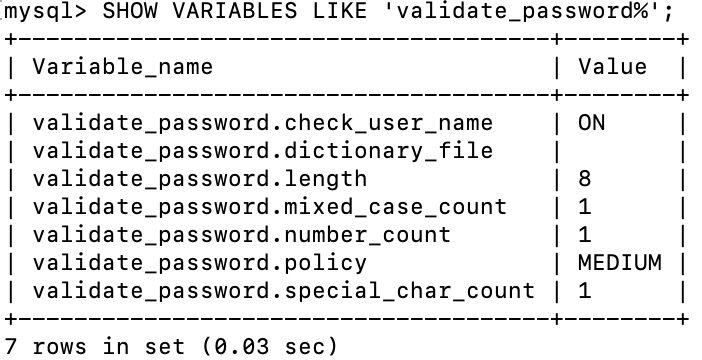 mysql> SHOW VARIABLES LIKE 'validate_password%';