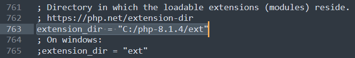 extension_dir의 맨 앞 부분 세미콜론(;)을 삭제하여 주석을 해제해주고, php 파일들을 압축 해제한 경로를 적어준다. 그리고 경로 끝에 /ext를 붙인다.