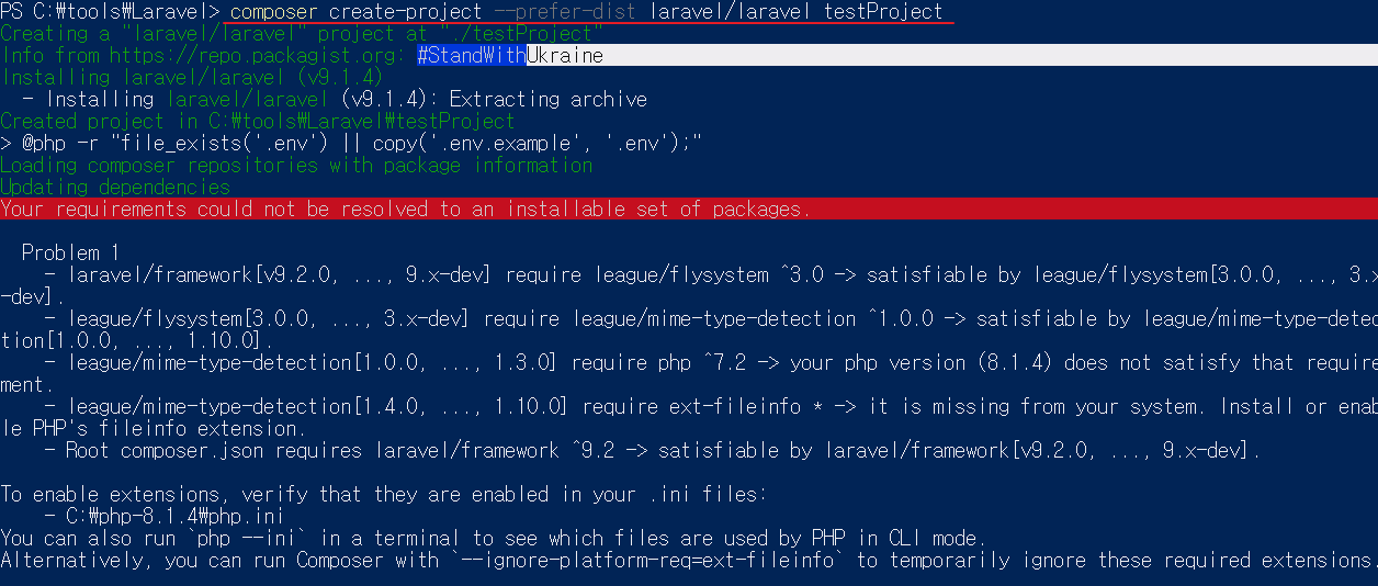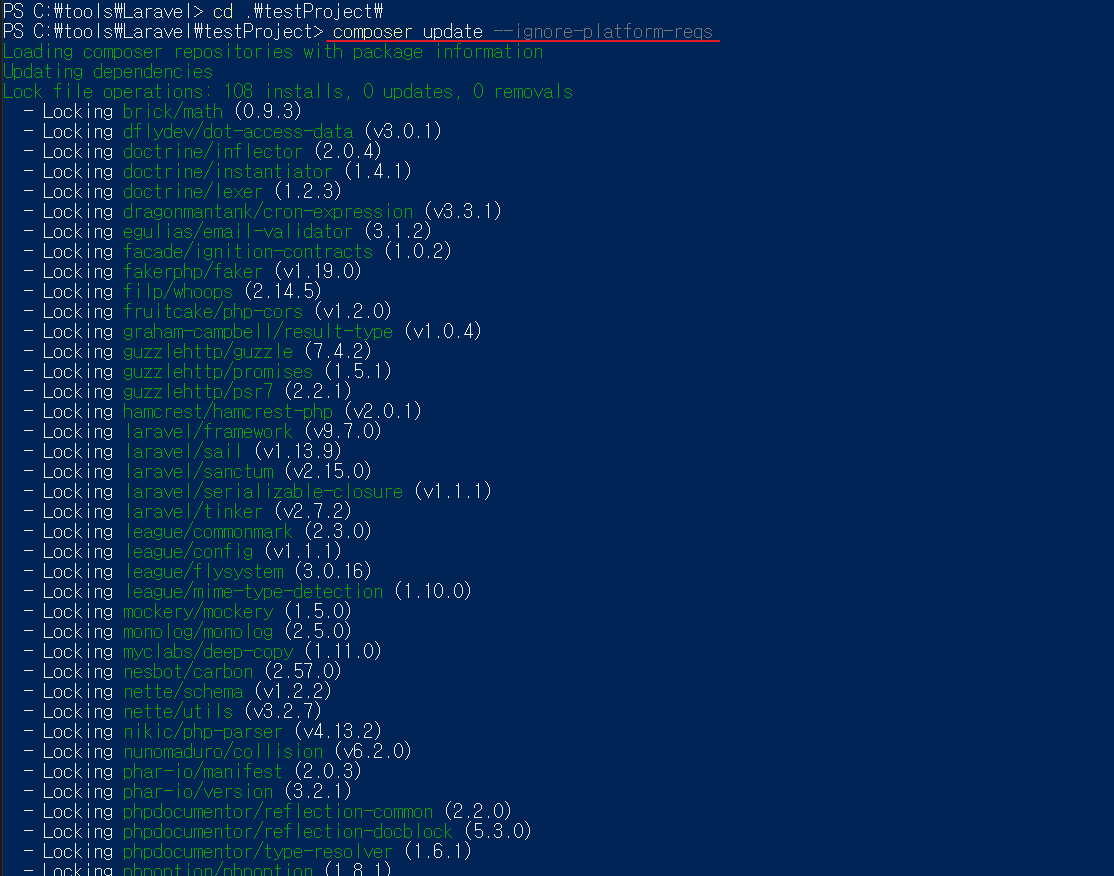 만약 나처럼 "Your requirements could not be resolved to an installable set of packages."라는 경고 메시지가 뜬다면, 설치된 프로젝트 폴더 안으로 이동해서 composer update를 쳐준다.