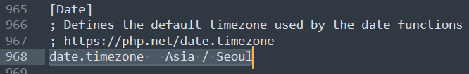 date.timezone도 똑같이 세미콜론(;) 제거 후 "Asia / Seoul"을 명시해준다. 위에 캡쳐가 잘못되었는데.. 양옆에 쌍따옴표 꼭 할 것!