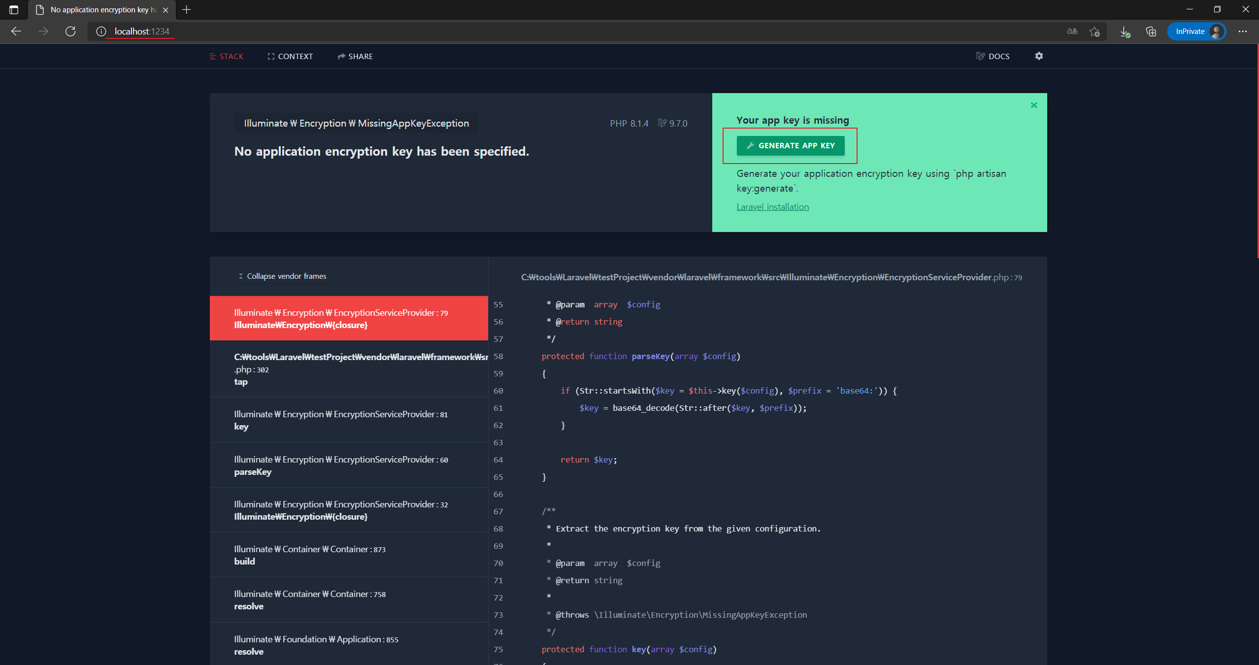 브라우저를 열고 해당 포트로 로컬호스트 접속하면 위와 같은 화면이 뜨는데, GENERATE APP KEY 버튼을 클릭하면 index 화면으로 이동할 수 있다.