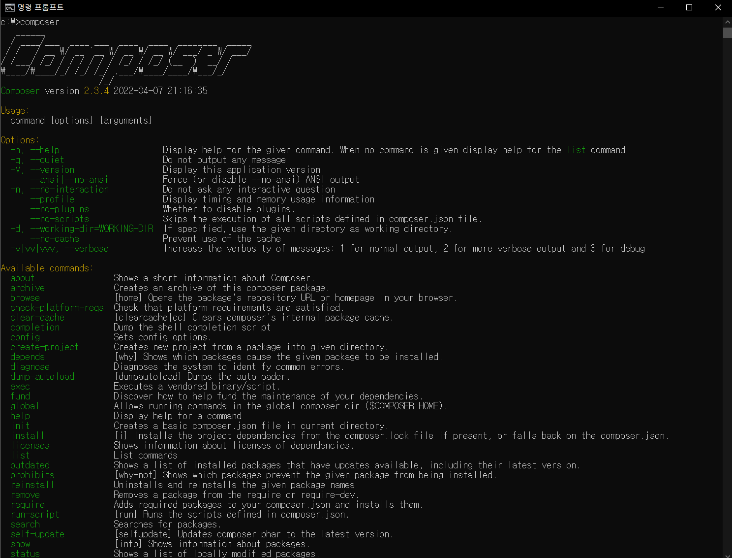 cmd 명령 프롬프트에 "composer"라고 쳐서 저렇게 뜬다면 제대로 설치된 거다.